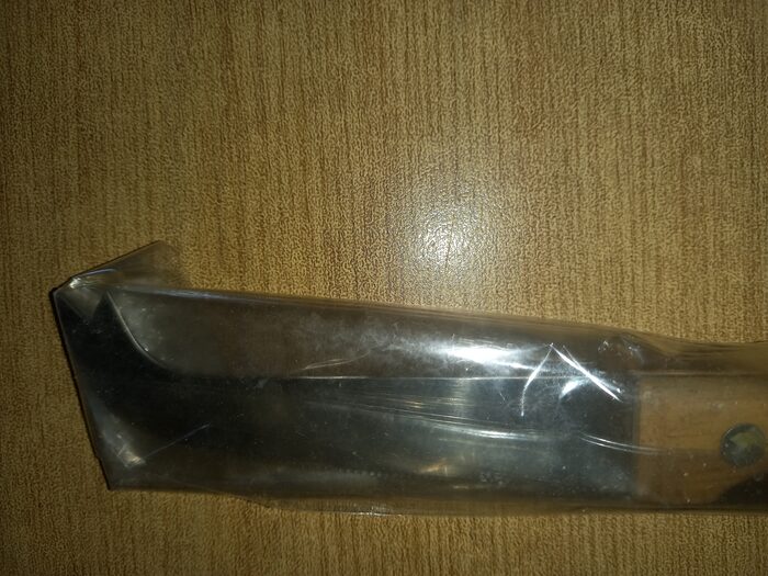 Manico in legno, lama dentellata ( lunga circa 9,5 cm) più a doppia punta per raccogliere il formaggio, lunghezza totale cm 21 .