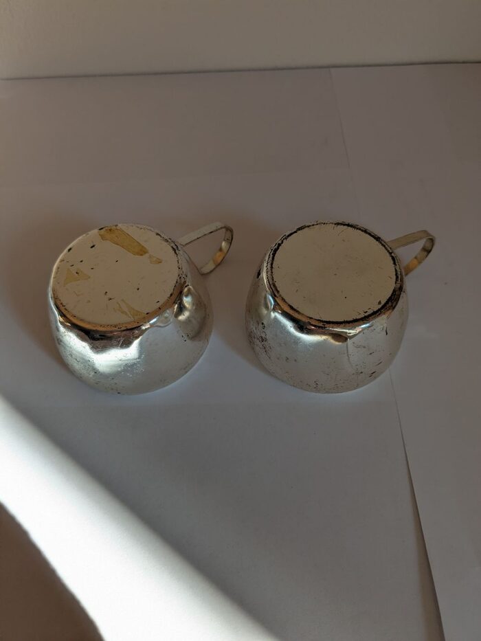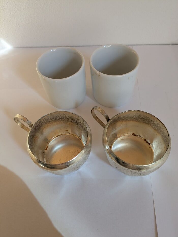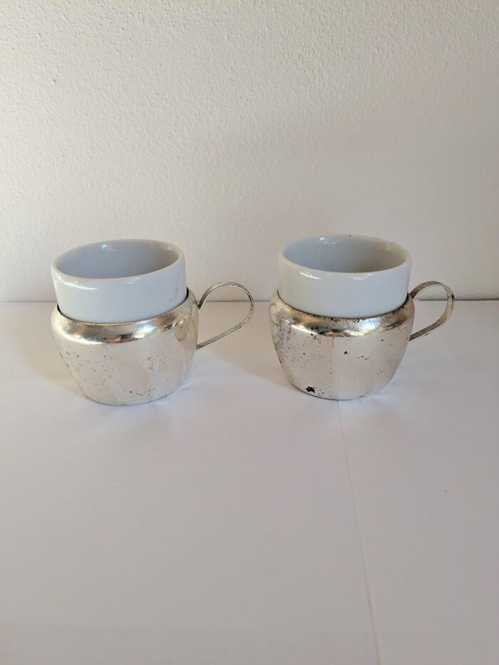 Coppia di tazzine composte da fondo in metallo con manico ed interno in porcellana bianca. La parte in metallo è molto vissuta, la parte in porcellana invece è senza difetti .