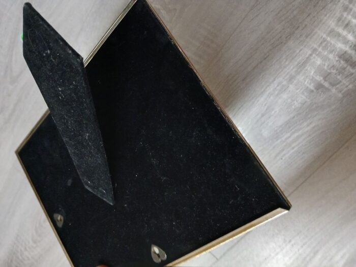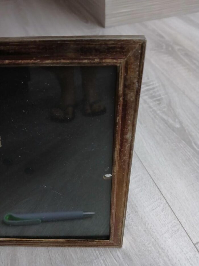 Cornice da tavolo. Non capisco se il bordo è invecchiato o così dall''inizio ma l''effetto a me piace. La parte bassa non ha il fermo ma tenendola sul tavolo non credo che l''eventuale foto possa cadere. Penna per le dimensioni. .