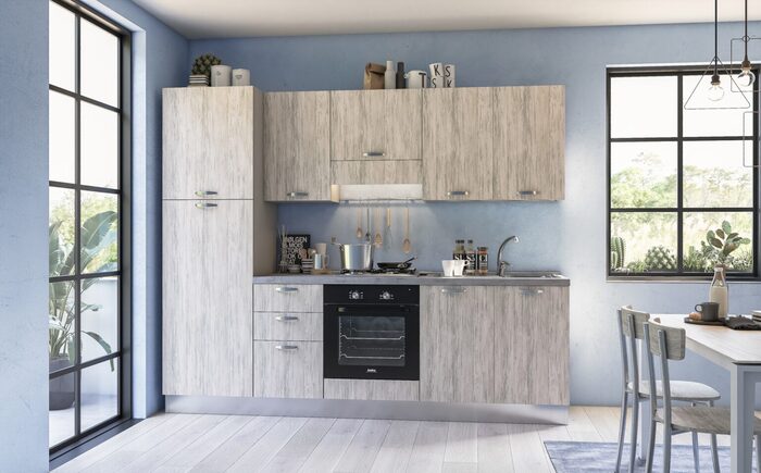 lunga massimo 2,5 metri, come pezzo unico, con attacco a gas GPL; con elettrodomestici possibilmente, più eventuali mensole/accessori oltre quella misura .