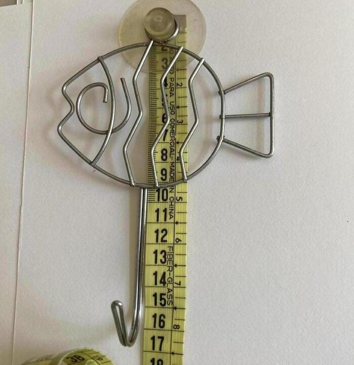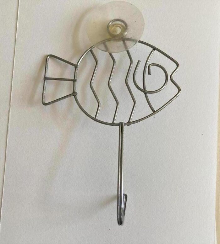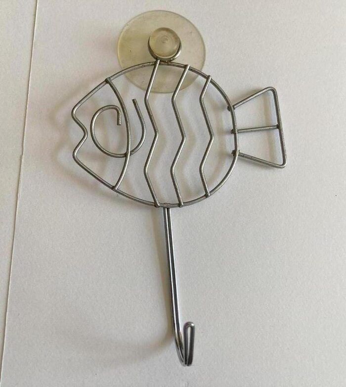 Appendino in metallo con ventosa in silicone che tiene molto bene sulle piastrelle lucide. Non lo uso più da quando mi sono trasferita un anno fa. Sempre usato nella stanza da bagno, infatti ha qualche segno di ossidazione dovuto all’umidità: magari pulendolo bene viene via. Lunghezza circa 16,5 cm, esclusa ventosa. .