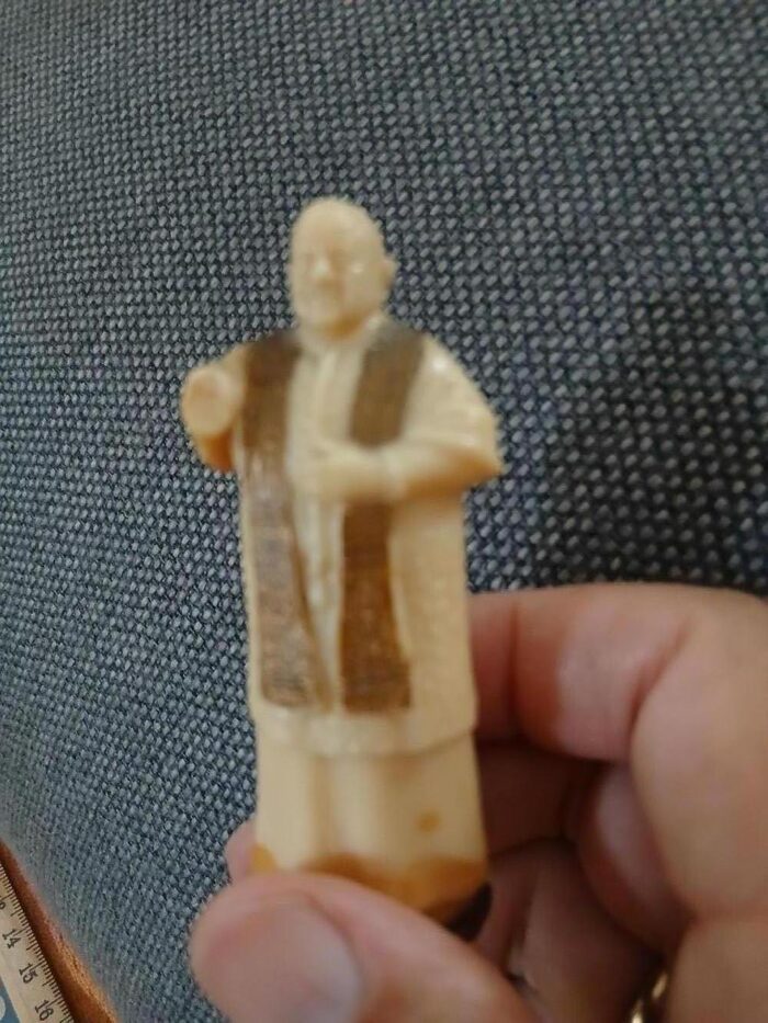 Come salla foto, ha purtroppo il braccio destro mozzato. È in plastica rigida, altezza circa 7 cm. Non so se faceva parte di una composizione perché la parte in basso del talare è più scura. .