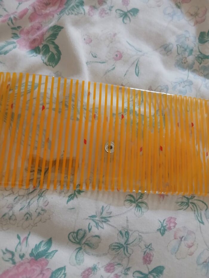Piccola pochette/ astuccio trasparente con bottone per la chiusura, a righe gialle verticali con puntini rossi. Dimensioni 21,5 cm x 9,5 cm. .