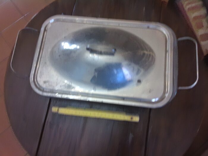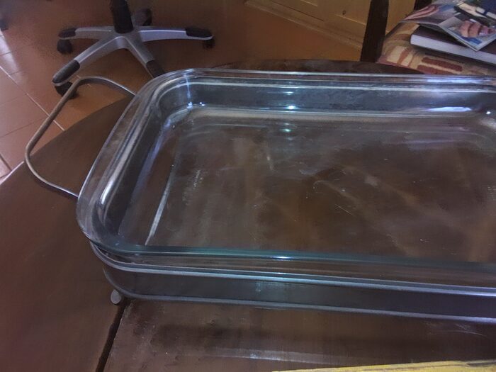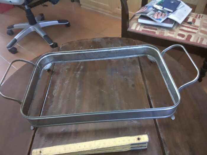 Pirofila da forno con coperchio e base di silver, comodissima da portare in tavola o pê tenere in caldo. Il coperchio è un po' rovinato ma qualcuno più bravo e paziente di me può farlo tornare lucido, io non mi sono provata per evitare dì fare danni, visto che è rimasta in credenza per tanti anni a prendere polvere....Metro per dimensioni .