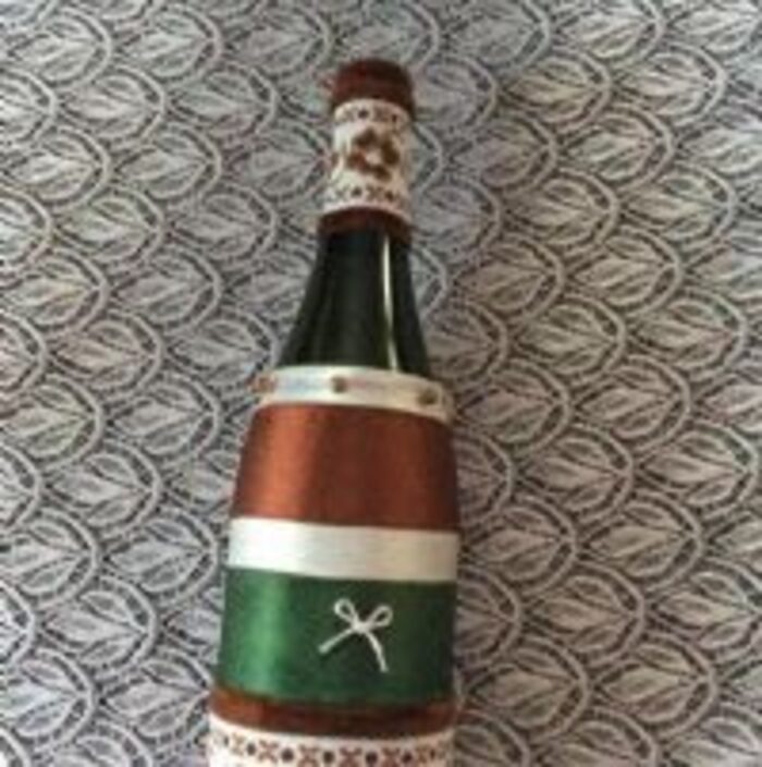 BOTTIGLIA di vino 75cl decorata con nastri in raso e pizzo, da utilizzare come vaso o porta candele .