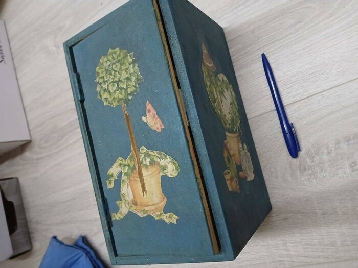 Scatola di legno fatta a decoupage. Molto ampia. Si apre con chiusura a pressione perfettamente funzionante. Ha la fessura sopra per usarla anche come salvadanaio. Solo da ripulire un pochino.
