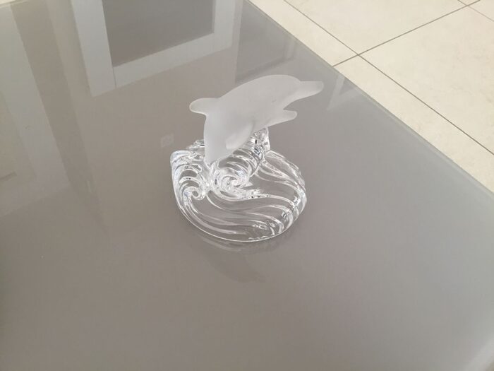 Soprammobile in vetro: due delfini che saltano sopra le onde. I delfini sono in vetro satinato e le onde della base in vetro trasparente.Si può usare anche come fermacarte, essendo abbastanza pesante (530 g).Altezza circa 15 cm. Ingombro max della base 12x9,5.Preso qui ma rimetto in circolo: ho acculato troppe cose.Mi è arrivato integro imballato superbene, vedrò di fare altrettanto. .