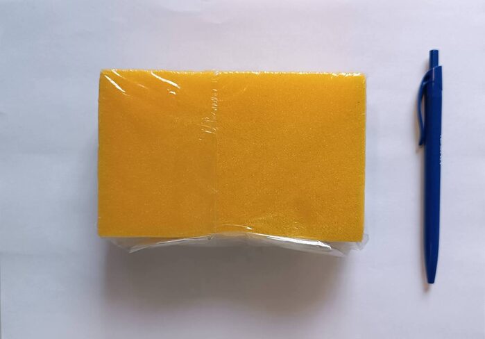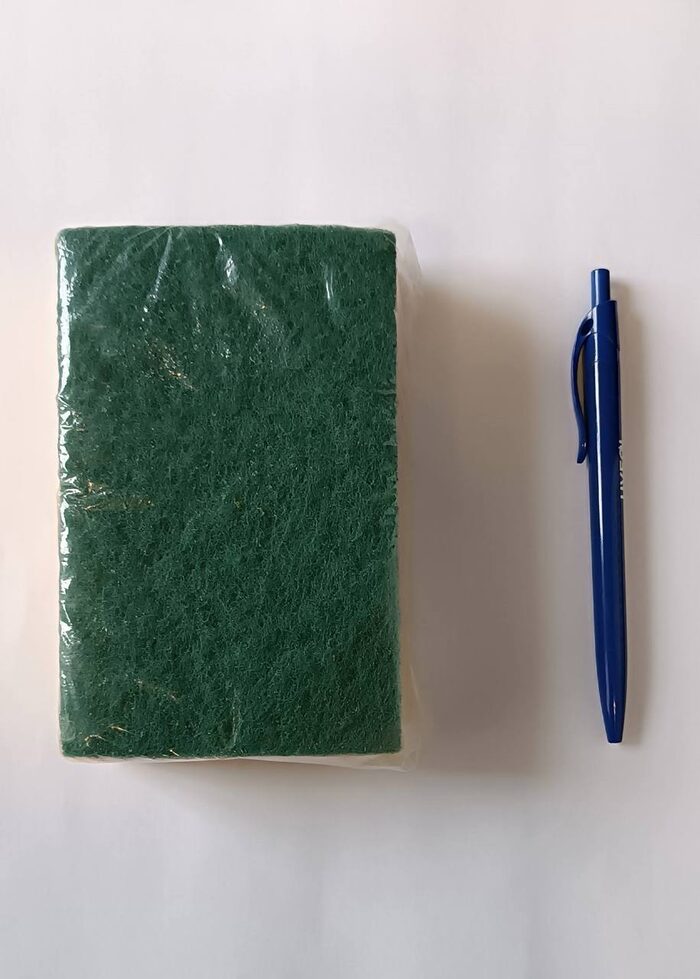 Spugnada un lato in fibra di nylon abrasiva, comunemente usata per la pulizia dei piatti o per operazioni di sgrassatura e dall'altro spugna diciamo classica.Nuova, ma era in una confezione da due. Misure: 14x8,5x4 cm .