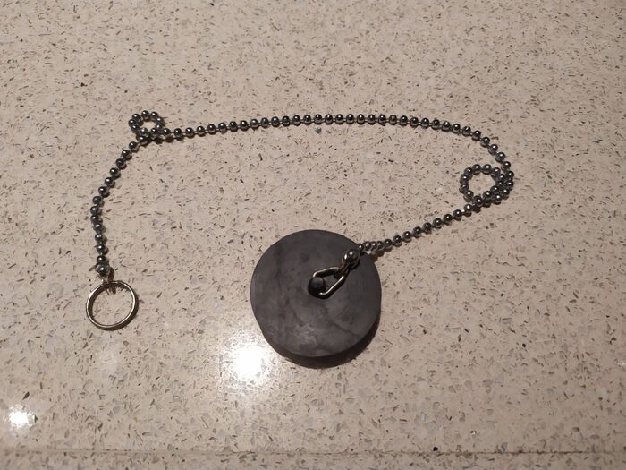 Tappo per lavandino in gomma semirigida con catenella, la catenella misura 38 cm ed il tappo ha diametro superiore 40 mm e inferiore 35 .