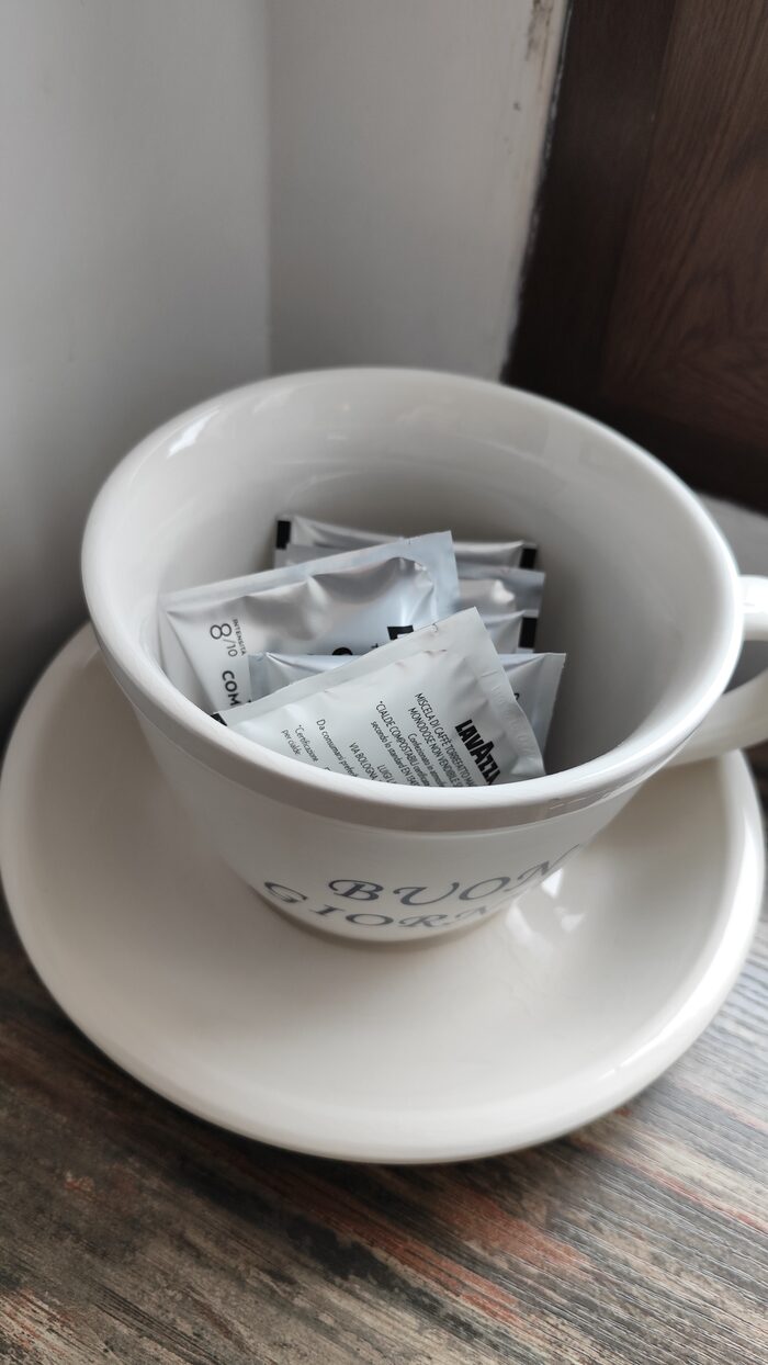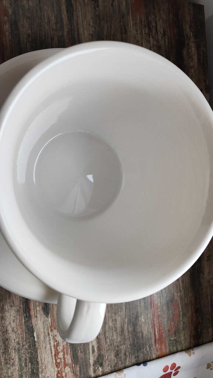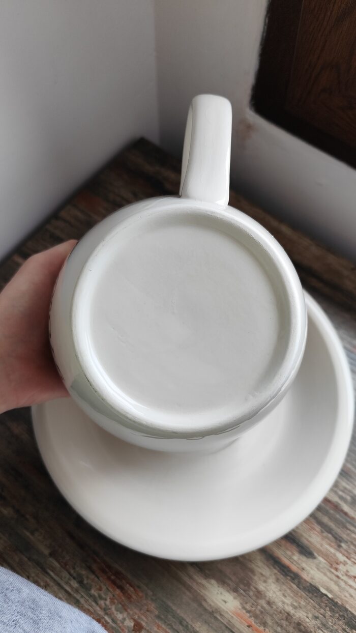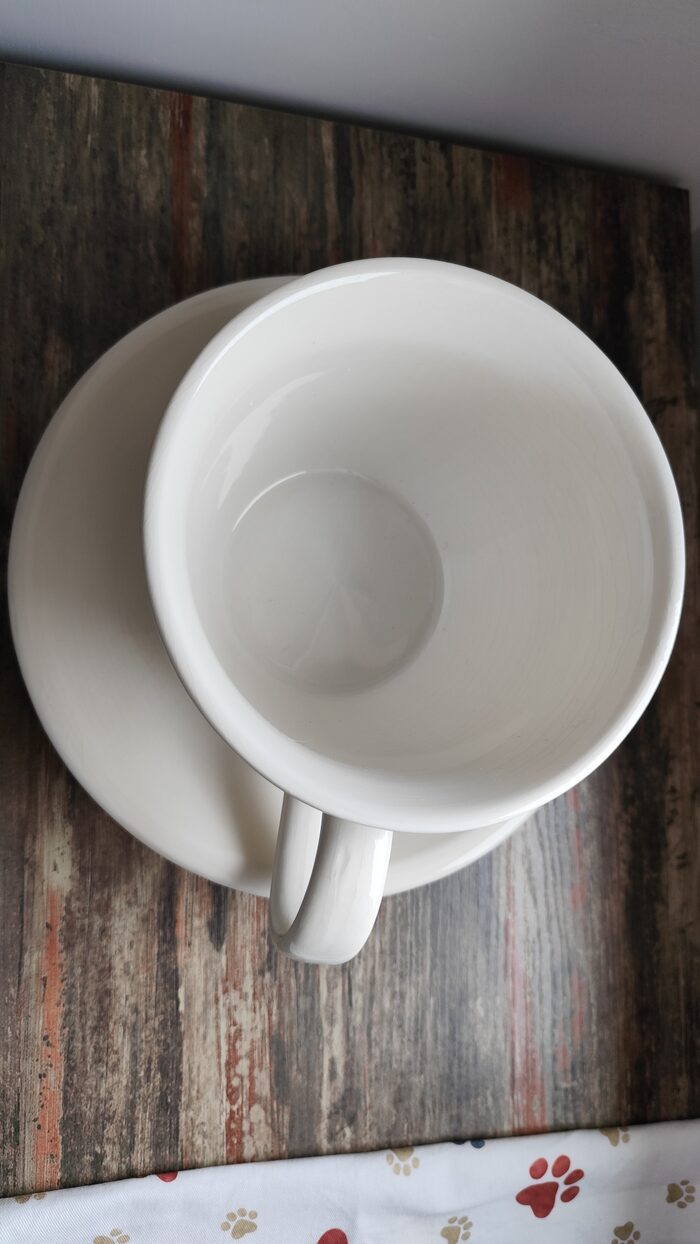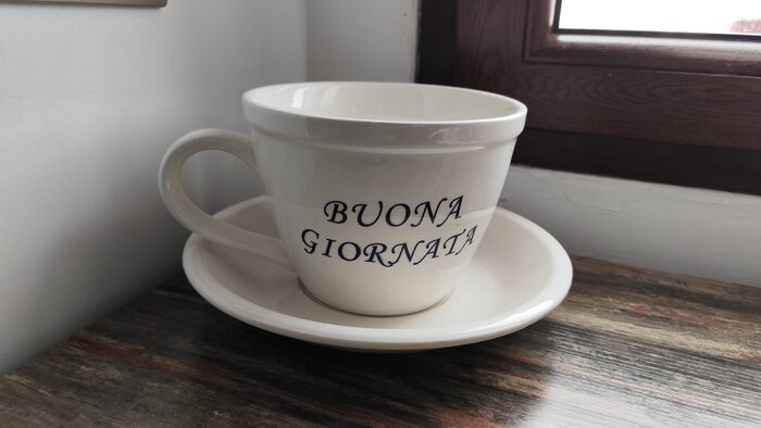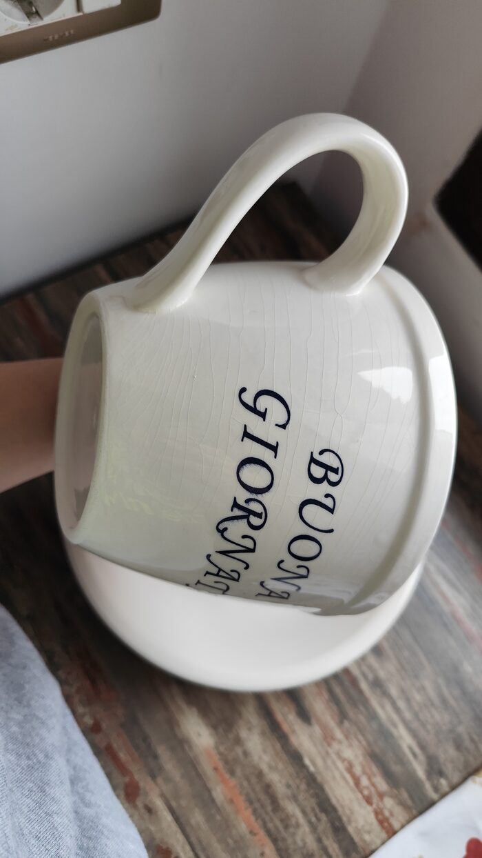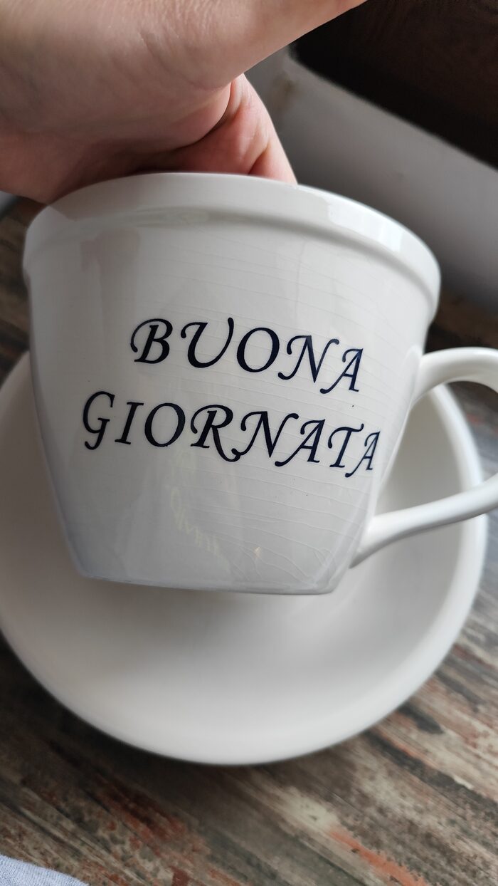 Tazza gigante con piattino decorativa, realizzata in ceramica color panna. Stile moderno o rustico, ha la scritta “Buona Giornata” su entrambe le facciate, può essere usata come porta cialde del caffè, zucchero o centro tavola, perfetta anche per bar e negozi. Oggetto in ottime condizioni, come da foto.