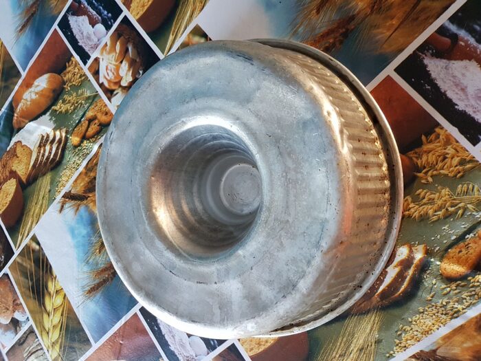 teglia in alluminio per ciambella, usata tantissimo, ammaccata e bruciacchiata, ma non rotta...cm 25 x 6,5 circa, può ancora essere sfruttata .