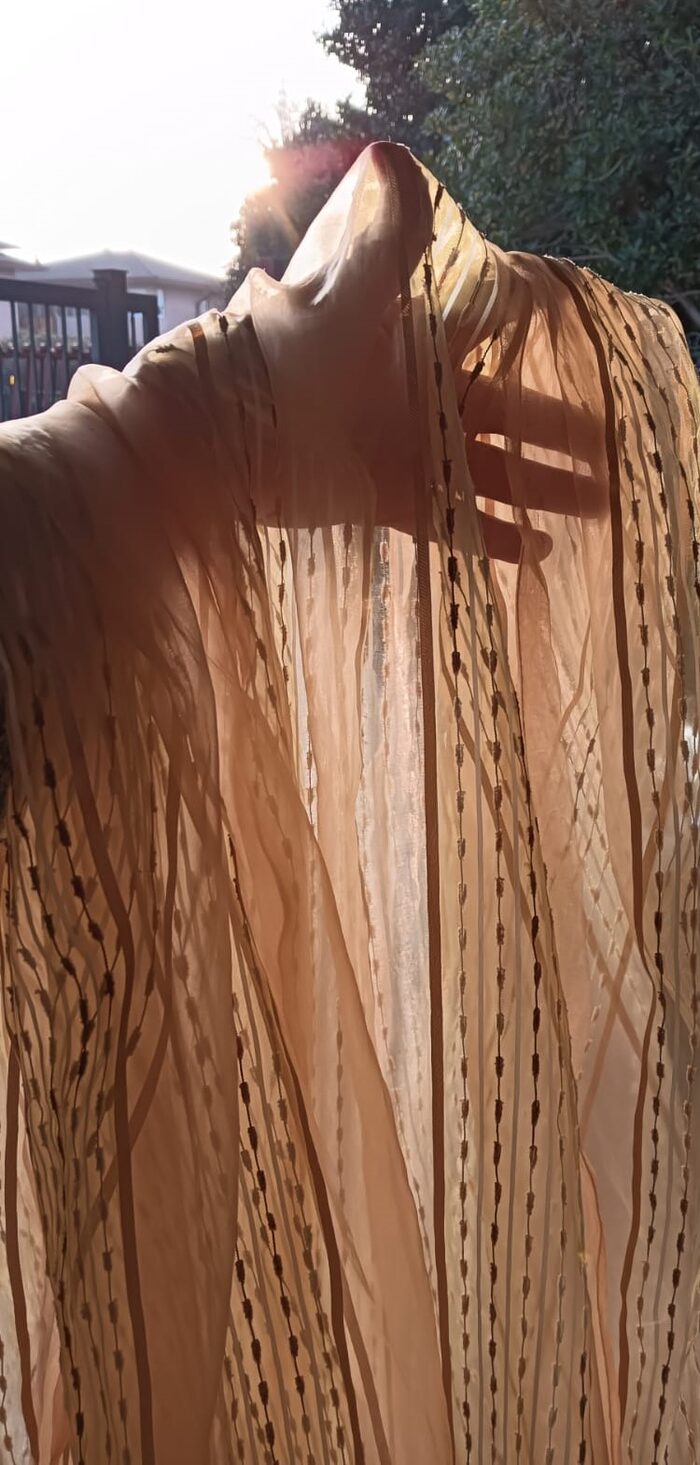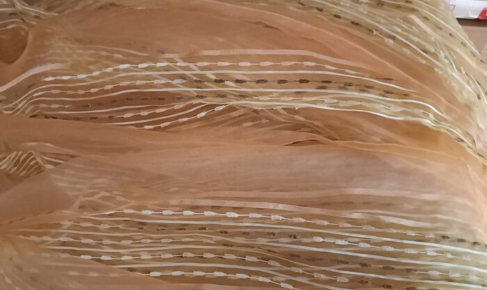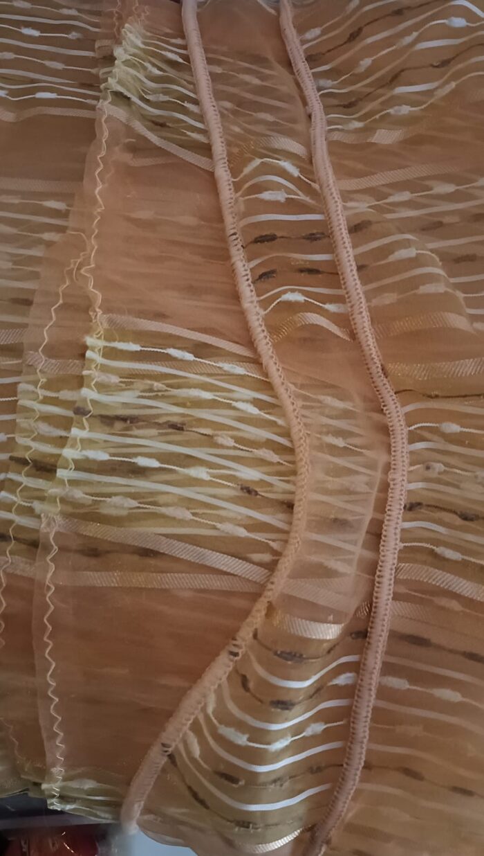 due tende trasparenti da rifinire in alto,in basso ha il filo di piombo. In materiale sintetico ma non lucido come le classiche tende ,di qualità migliore .Misure 260x140 il colore va dal giallo paglierino ad un quasi arancionato .