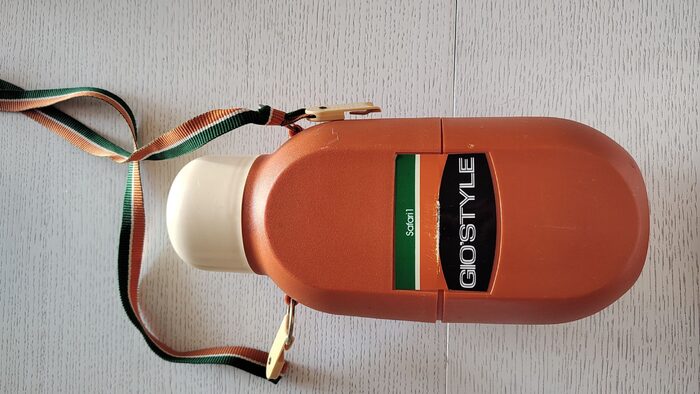 Termos vintage originale giostyle.Interno in vetro, esterno a tenuta.Capienza 1 litro.Segnalo solo un gancetto rotto della tracolla che non ne compromette l''utilizzo. .