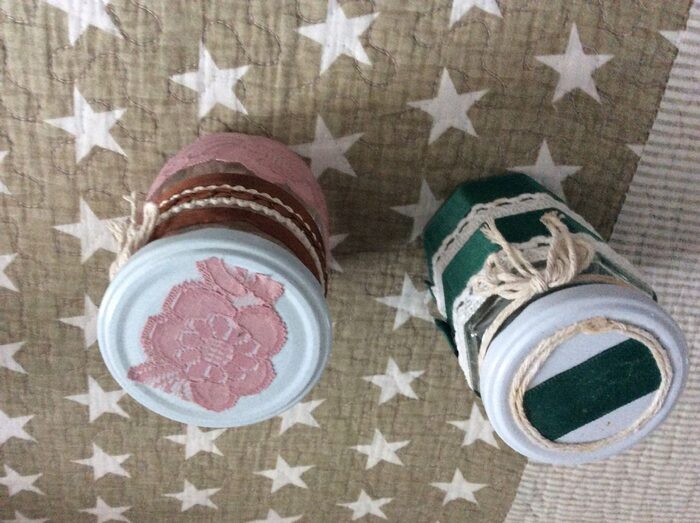 Vasetti formato marmellata decorati a mano con pizzi e raso, regalabili, da utilizzare x caramelle o fiori .