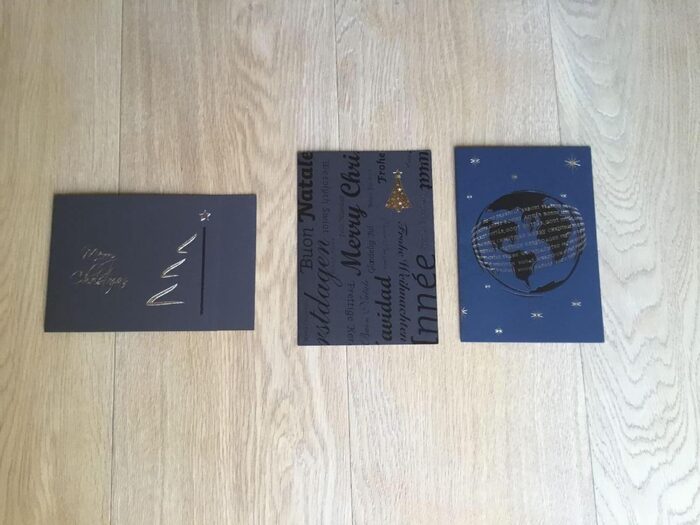 3 biglietti per auguri di Natale con logo Telethon, piegati a metà. 2 marrone scuro e uno blu. Due hanno biglietto chiaro all’interno con stampati gli Auguri, ma sostituibili a piacere, con qualcosa di personalizzato. Misura 16,5x11,5. 2 crediti tutti e 3 o 1 credito cadauno. .