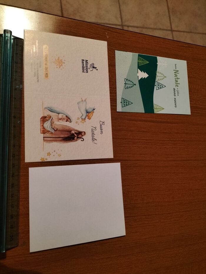 due biglietti di Natale, nuovi, logati, apribili, uno con e uno senza busta .