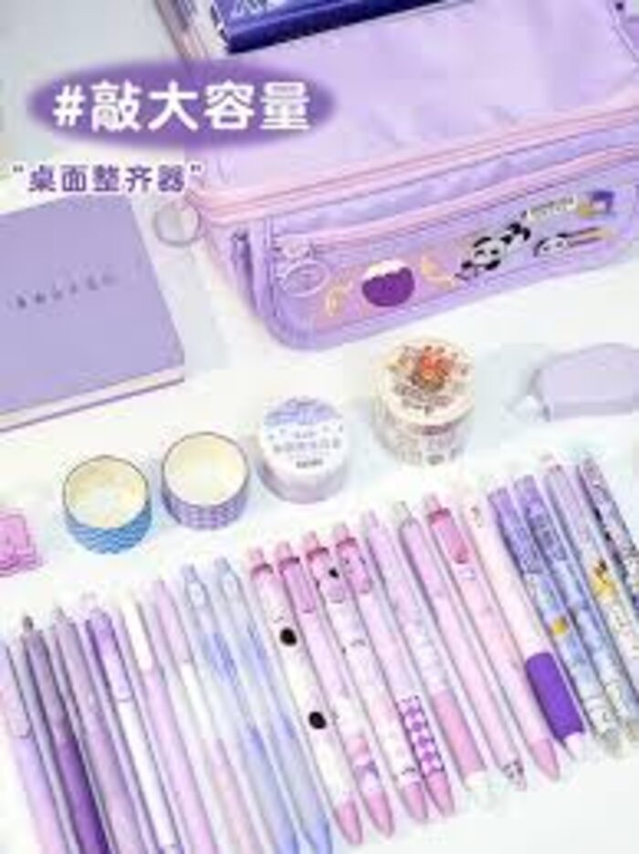 Possono esserci penne, matite, gomme, quaderni, block notes, port-it, evidenziatori, pennarelli, matite colorate, astucci etc