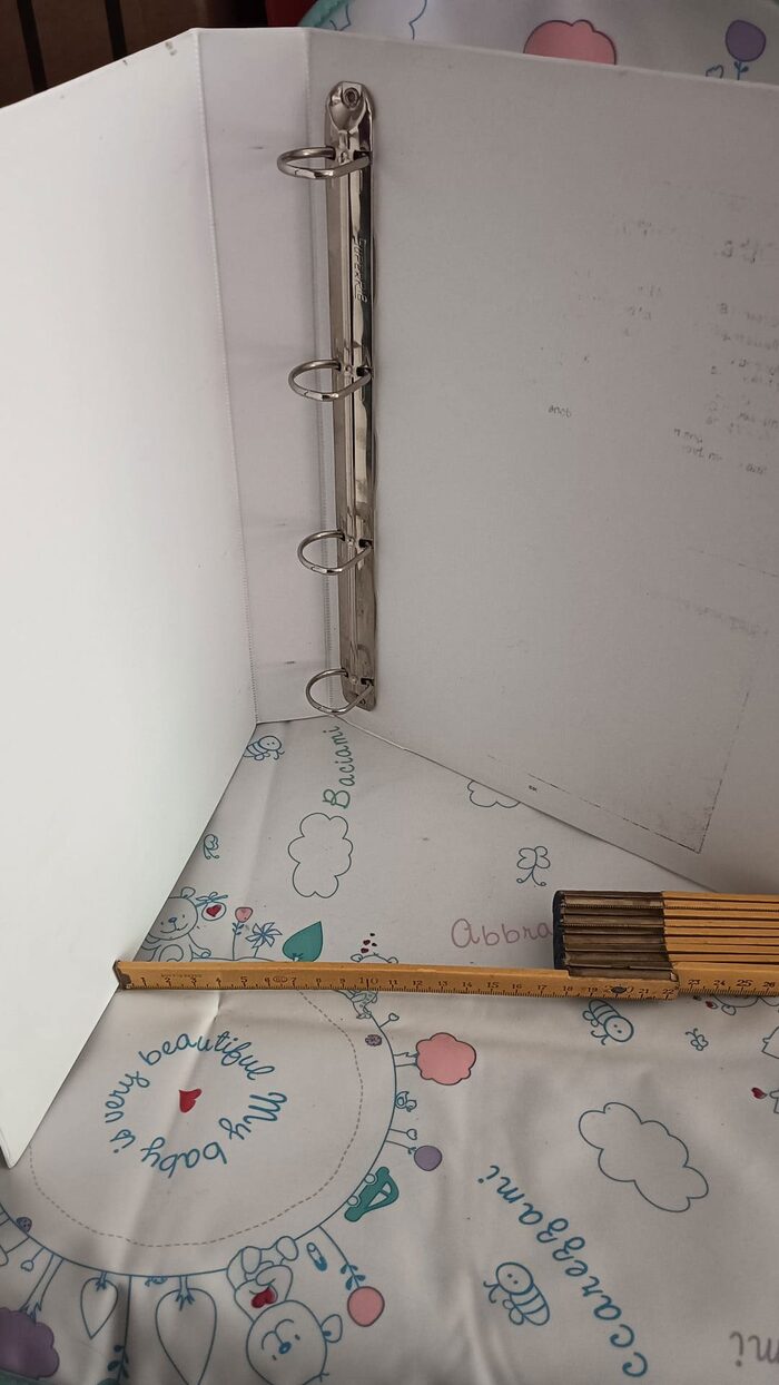quanderno ad anelli bianco in plastica rigida larghezza25*profondità4*altezza 31 per fogli A4 .