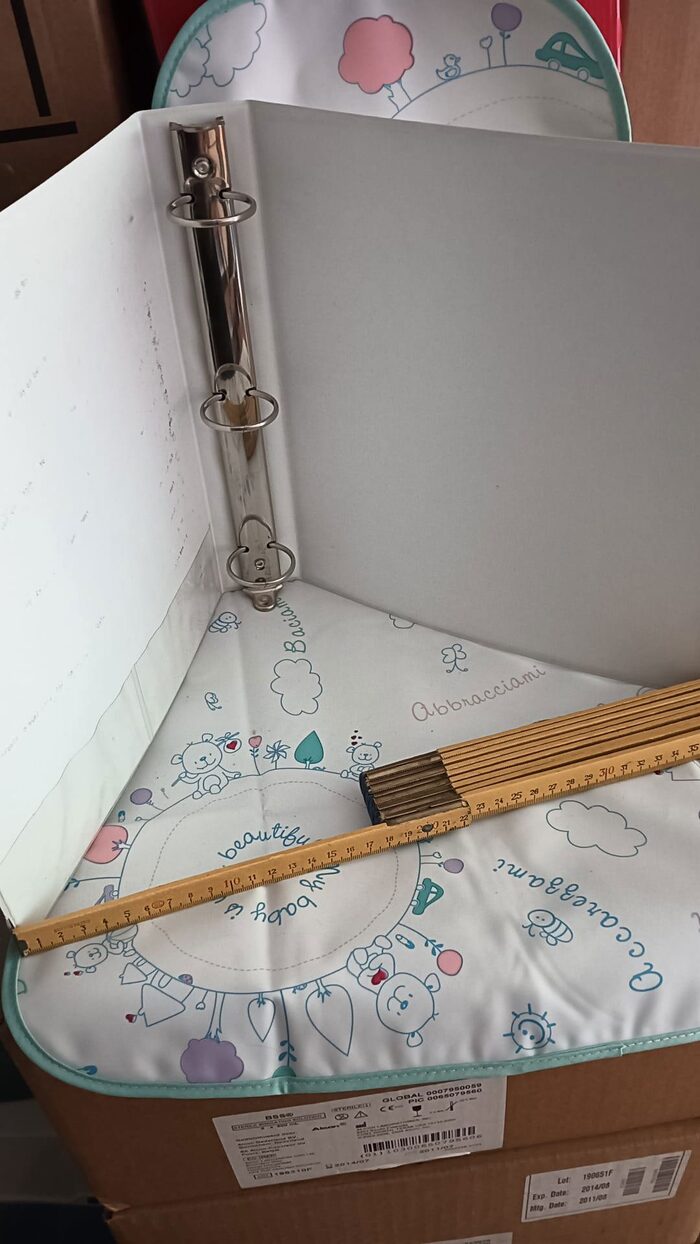quanderno ad anelli bianco in plastica rigida larghezza29*profondità 5 *altezza 26 per fogli un po più grando di A5 .