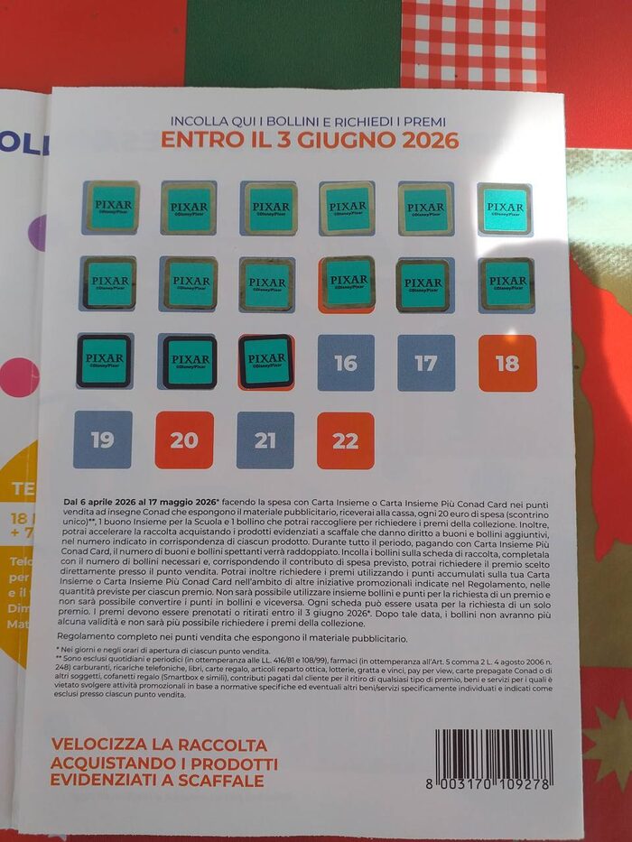 Scheda conad con 15 bollini attaccati per richiedere il premio .