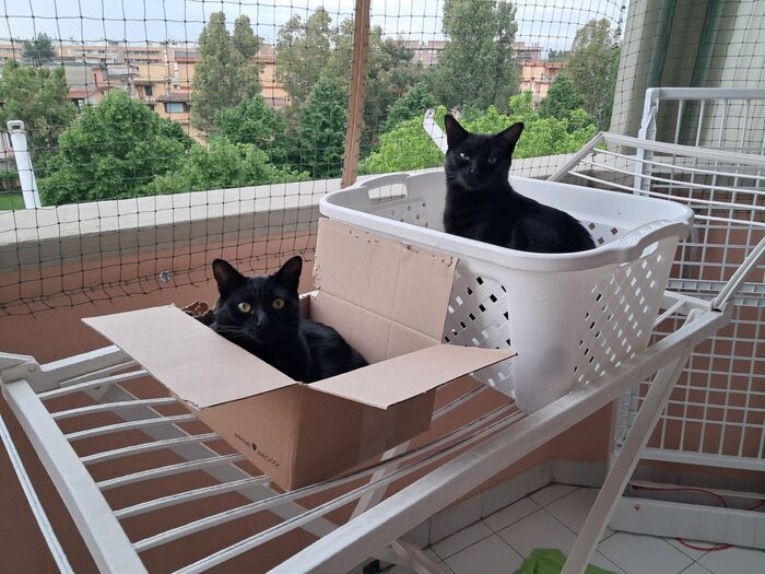 Le mie due gatte furie buie mi stanno spolpando viva!! Hanno 9 mesi, sono affettuose e rompiscatole e soprattutto una delle due mangia un bel po''...Perciò se avete cibo per gatti (sia umido che crocchette) specie per kitten ma anche per gatti adulti, di cui volete disfarvi, pensateci!Vi presento Bianca e Margot! .