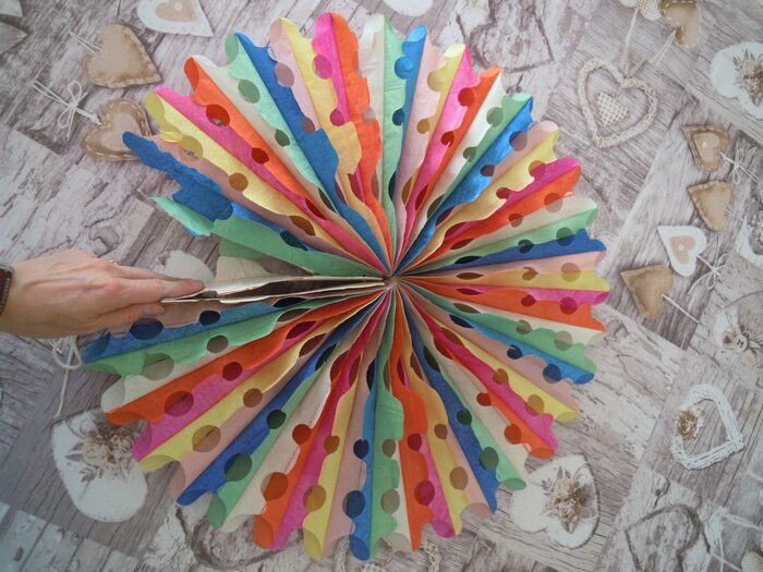 In carta velina, da appendere; è rovinato in una parte, ma penso si possa mettere un po' di colla e basta. Sarà 40cm di diametro, forse più, pieghevole. .